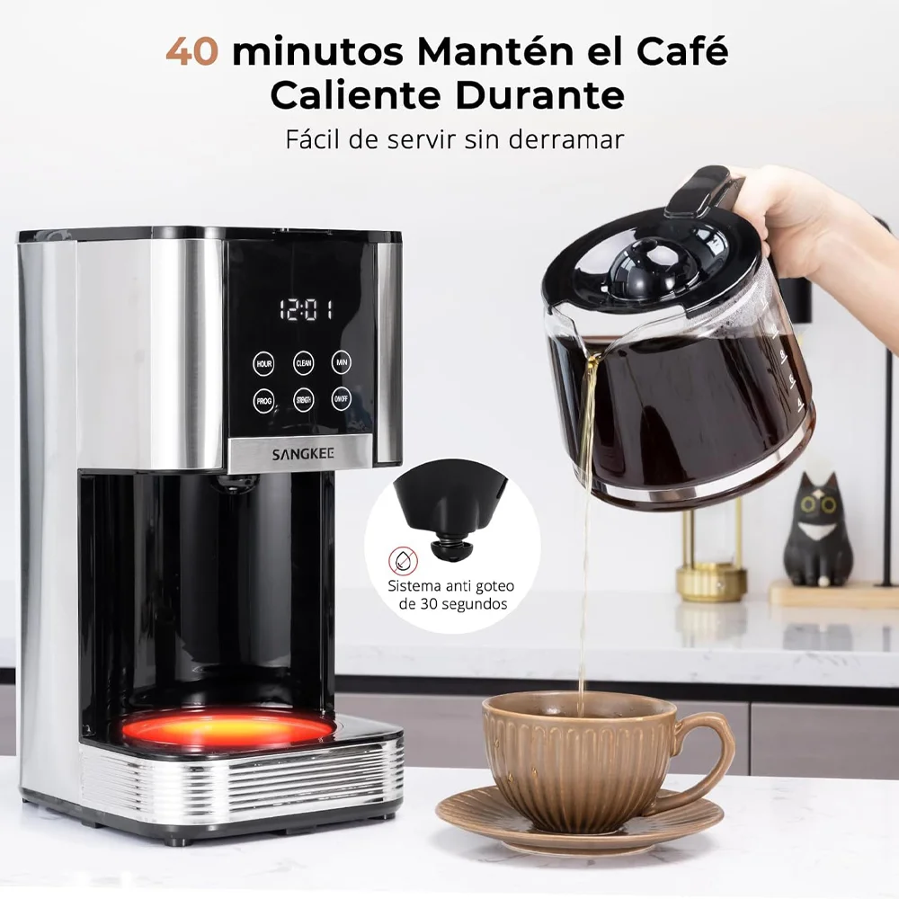 La placa calentadora mantiene tu café caliente hasta 40 minutos después de la preparación. Y la cafetera se apaga automáticamente después de 40 minutos para tu tranquilidad. Su diseño antigoteo previene fugas, asegurando una experiencia de vertido fácil y sin desorden.