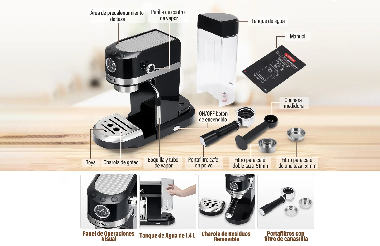 Máquina de Espresso *1, Filtro para una taza *1, Filtro para dos cargas * 1, Portafiltros *1, Cuchara con prensa *1.