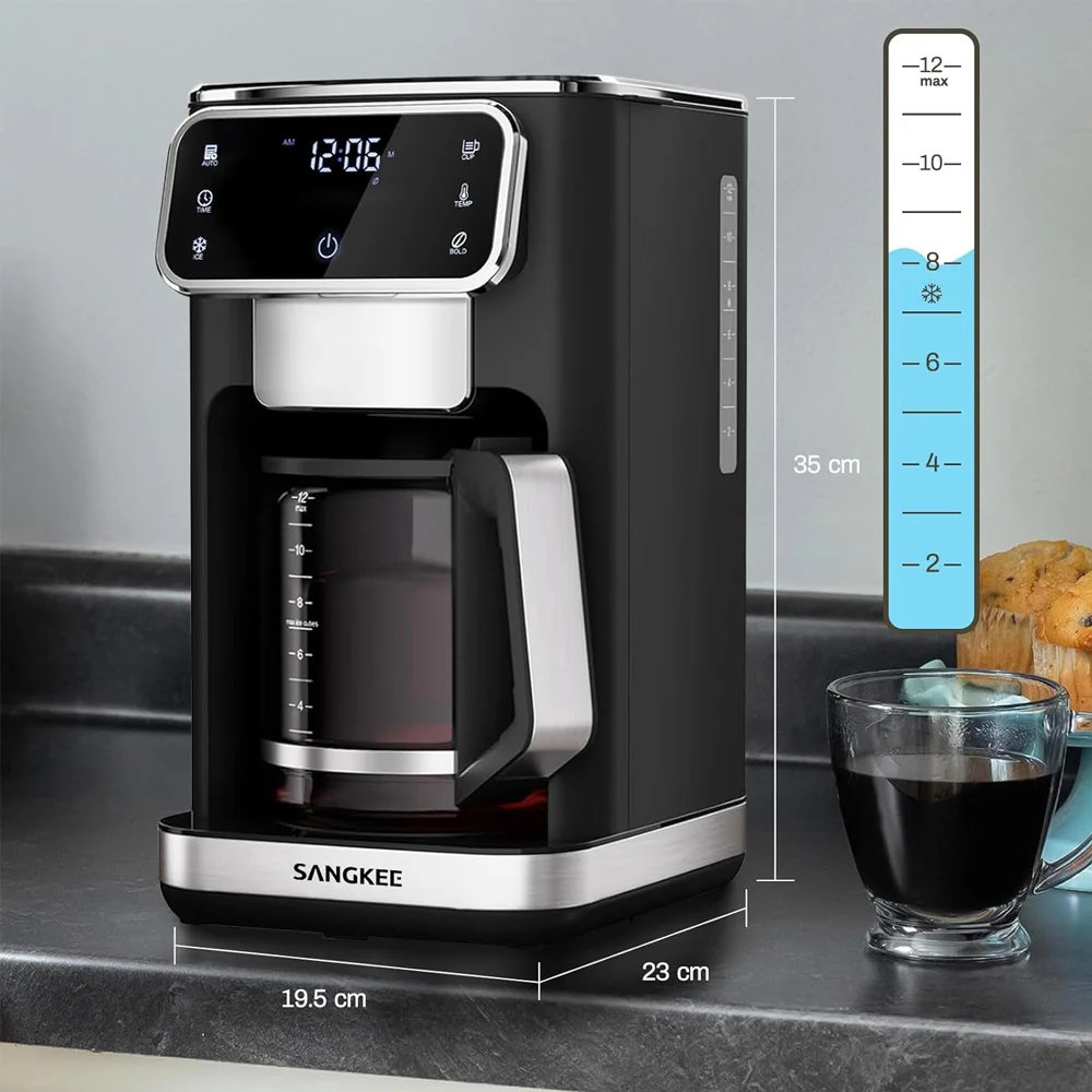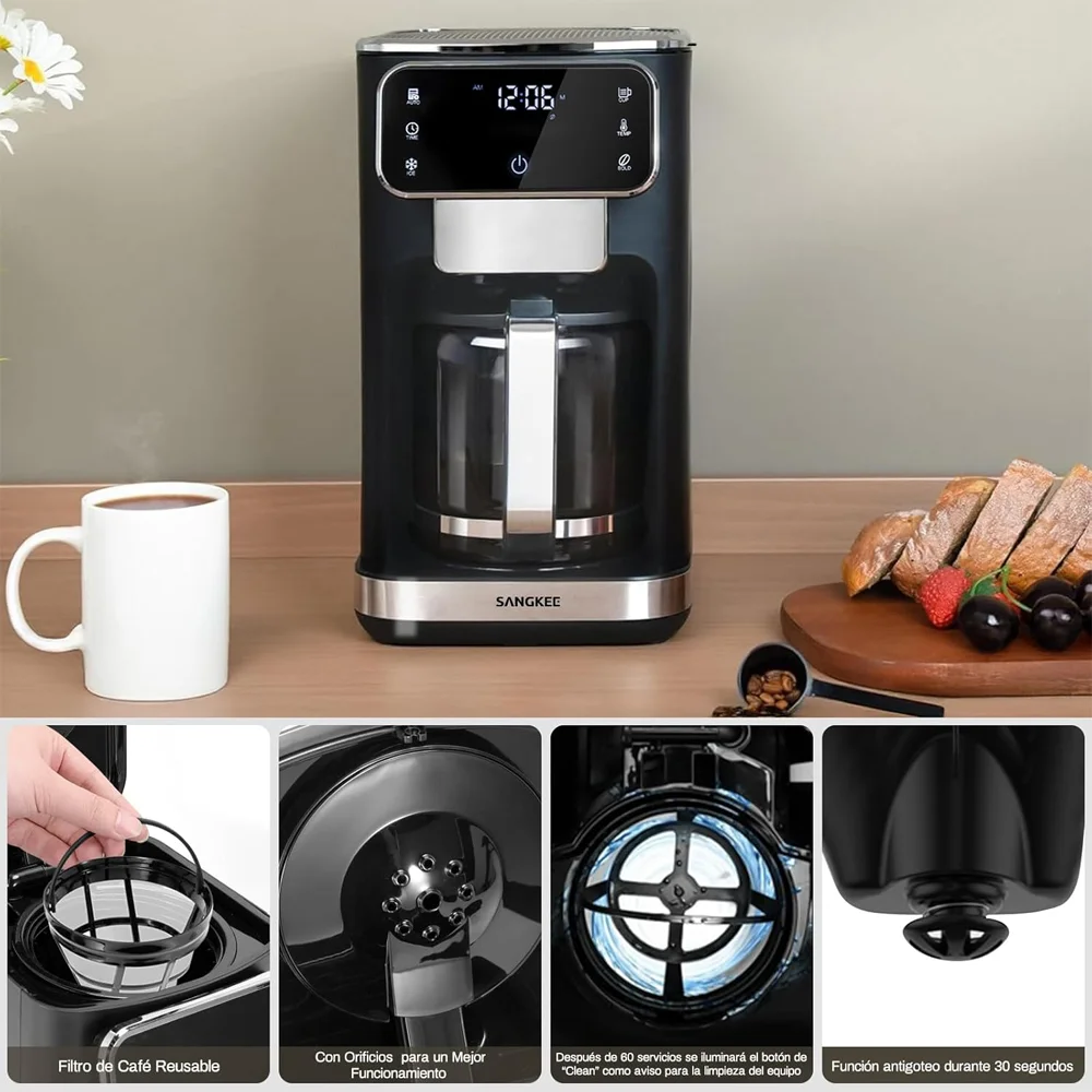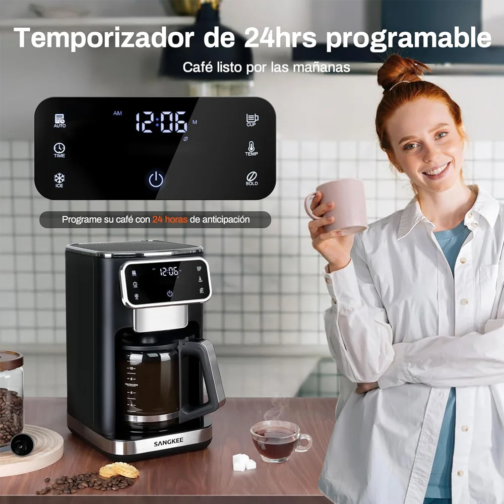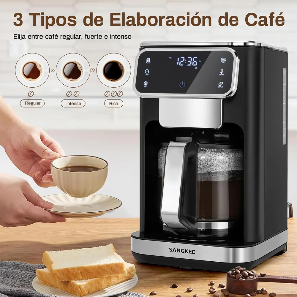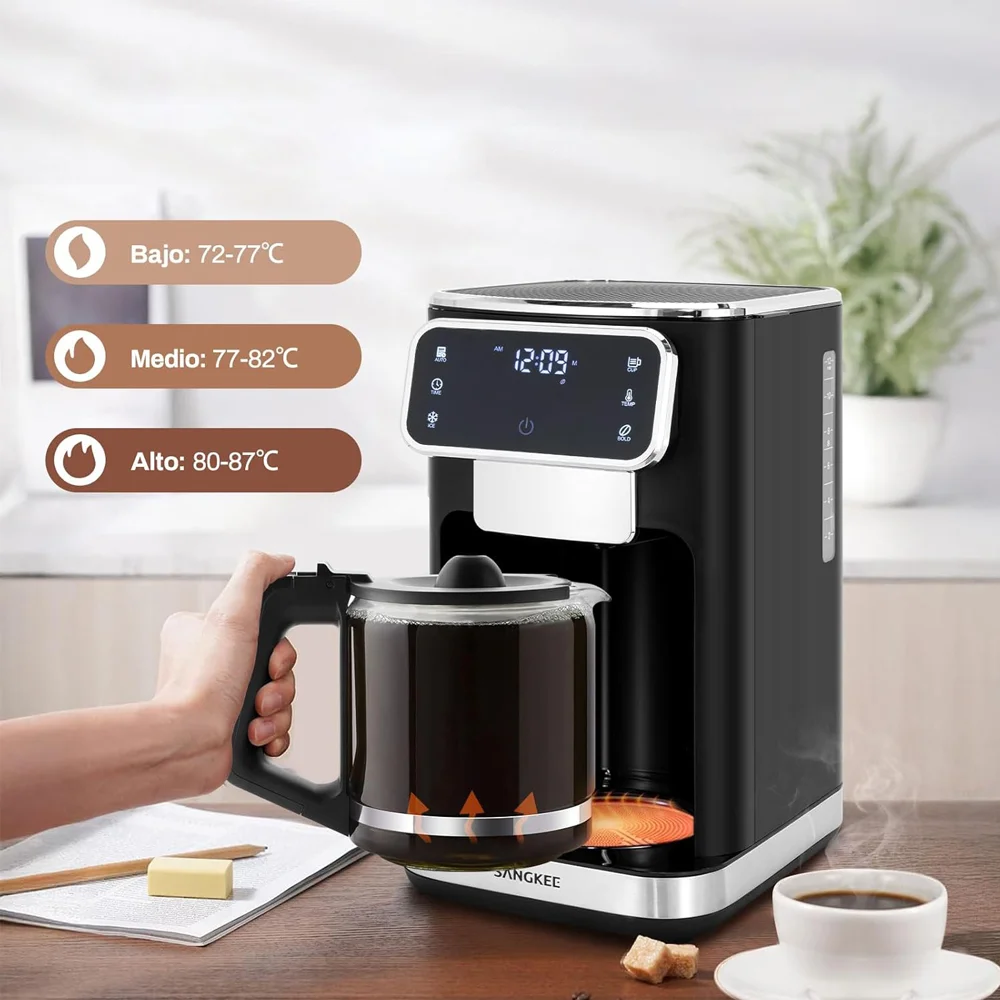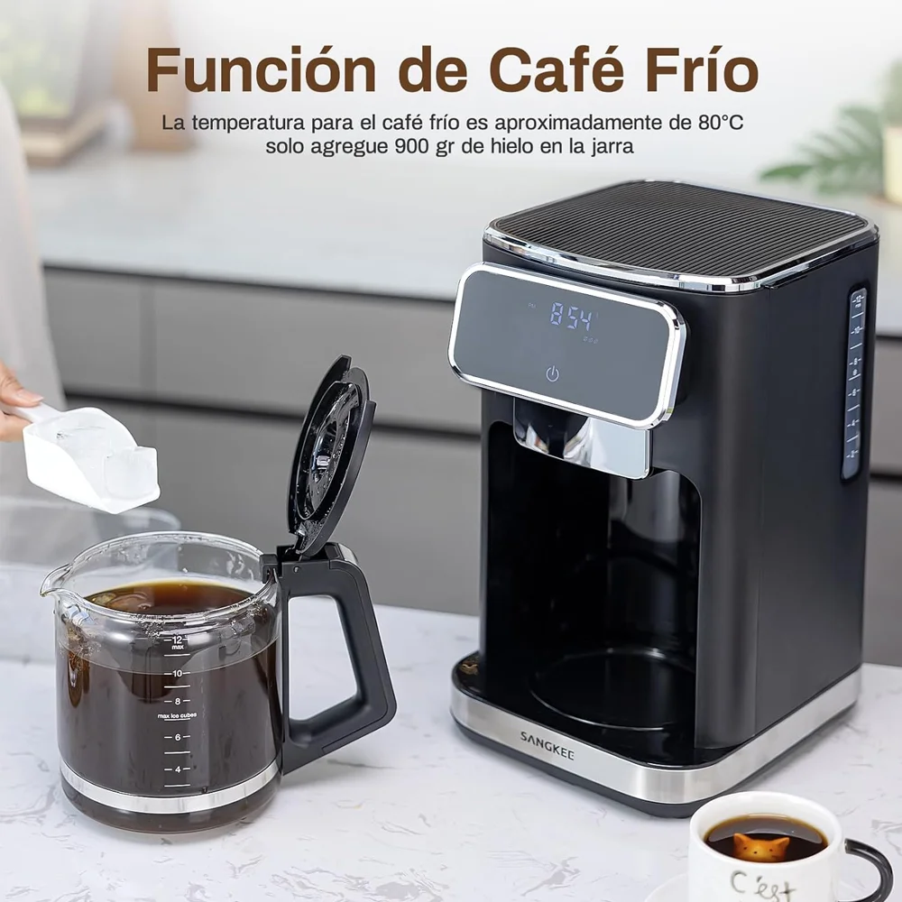 Disfruta de café personalizado con la cafetera de goteo SANGKEE de 12 tazas. Cuenta con pantalla táctil, ajuste de intensidad, función de café frío y filtro permanente para una experiencia óptima.