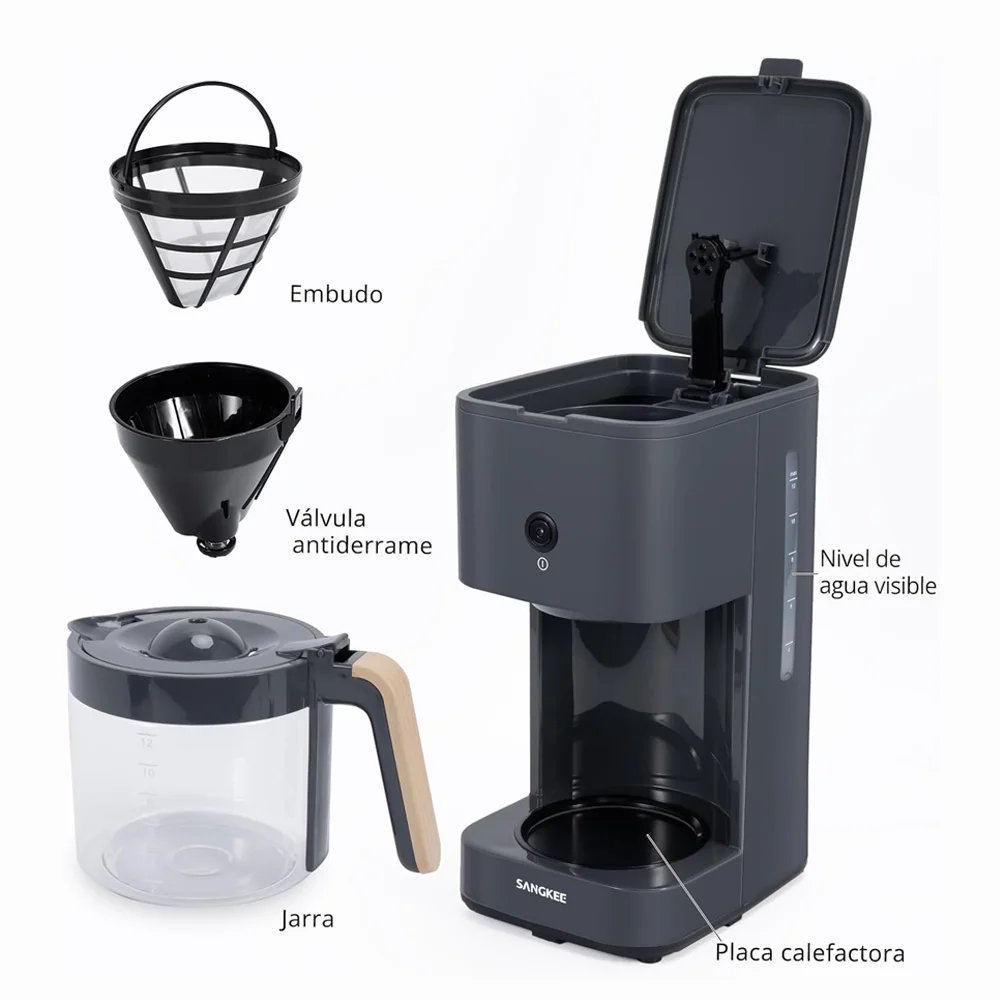 Con nuestra cafetera de goteo para 12 tazas, prepare una deliciosa taza de café en tan solo 3 a 5 minutos. El producto cuenta con un filtro para café reusable, una cuchara medidora, y una jarra con diseño de antigoteo, lo que garantiza el poder disfrutar de una experiencia de barista sin complicaciones. Solamente presione el botón de “on/off” y goce de sus mañanas libres de estrés y en compañía de una taza de café.